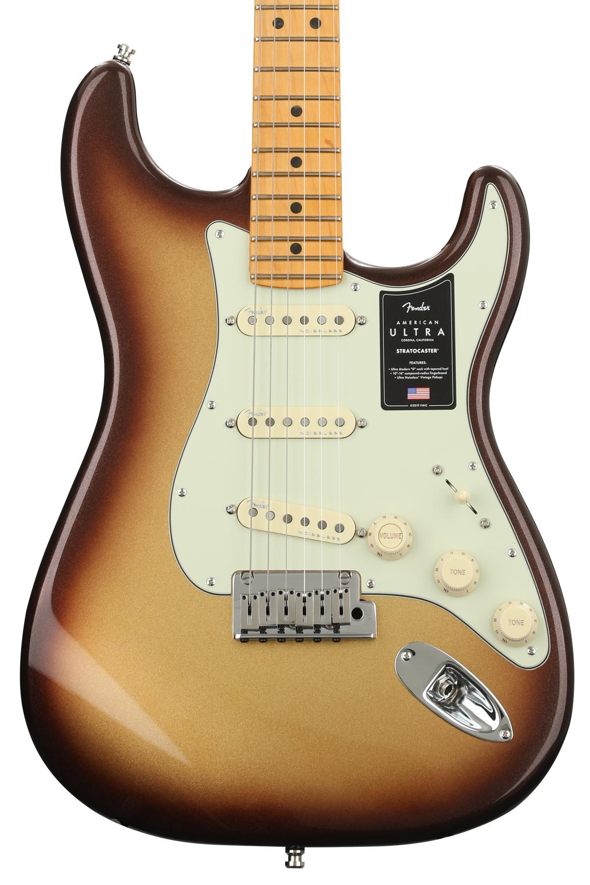 The American Ultra Stratocaster, while resembling a classic Fender Strat, boasts high-end components for those seeking a luxury guitar. It stands out with unique color options like Plasma Burst, Mocha Burst, and Texas Tea, offering a distinct aesthetic.