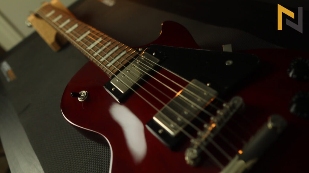 The body is pretty much a mahogany board with electronics and hardware on it. Of course, the design isn’t as simple as it may seem at first. The body comes with slightly contoured edges and cleverly designed indents on the cutaways.